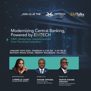 Culminating the day’s event, Mr. Awagah shared the stage with Mr. Kwame Oppong, Director of Fintech and Innovation at the Bank of Ghana, who joined in virtually, with MsCarmelle Cadet, Founder and CEO of EMTECH, a renowned suptech platform at the forefront of digitizing regulatory processes, in a compelling discussion titled “CBDC Masterclass: Lessons Learned from the eCedi Hackathon.” This insightful session delved into the intricacies of Central Bank Digital Currency (CBDC) implementation, drawing lessons from Ghana’s groundbreaking eCedi.